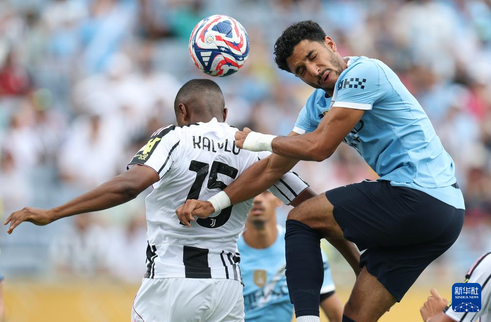 6月26日,曼城队球员马尔穆什(右)与尤文图斯队球员卡卢卢(左)在比赛中争顶。