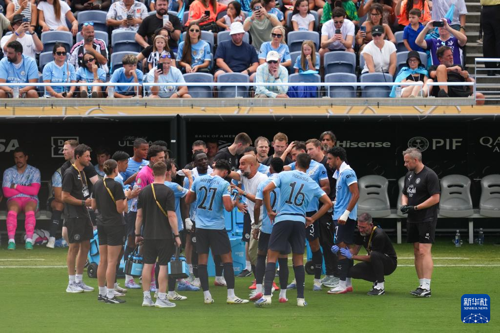 6月26日,曼城队主教练瓜迪奥拉(中)在比赛暂停时部署战术。