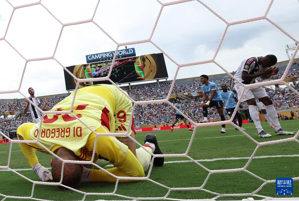 6月26日,尤文图斯队门将迪格雷戈里奥(右前)未能扑救曼城队球员多库的射门。
