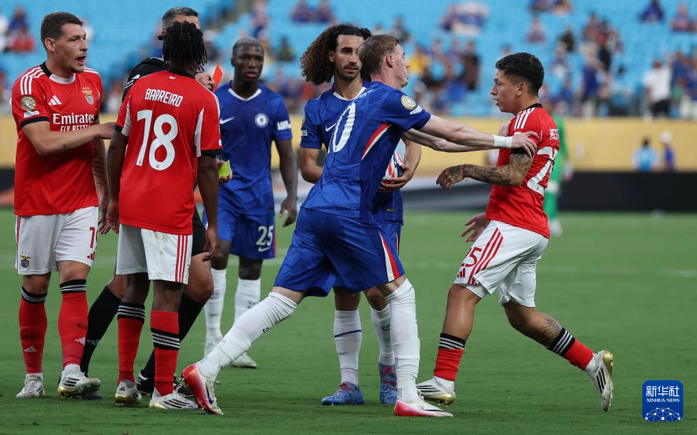 6月28日,切尔西队球员帕尔默(右二)在比赛中催赶被红牌罚下的本菲卡队球员普雷斯蒂安尼(右一)离场。
