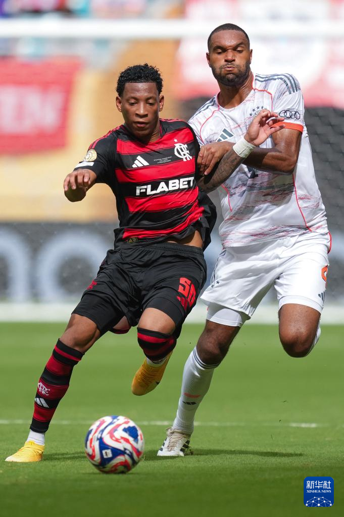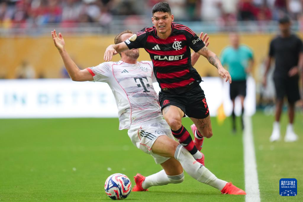 6月29日,弗拉门戈队球员艾尔顿·卢卡斯(右)和拜仁慕尼黑队球员凯恩在比赛中拼抢。
