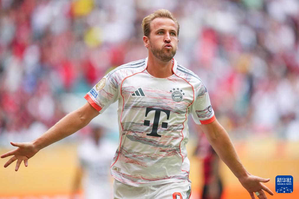 6月29日,拜仁慕尼黑队球员凯恩在比赛中庆祝进球。