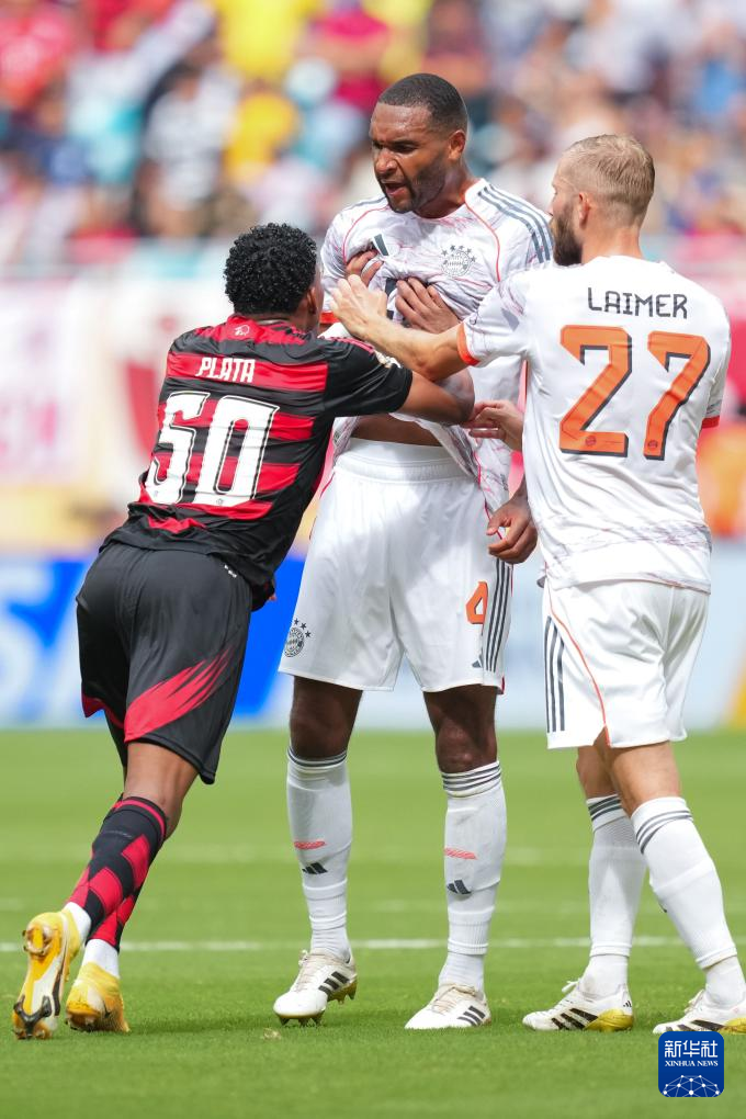6月29日,弗拉门戈队球员普拉塔(左)和拜仁慕尼黑队球员约纳坦·塔(中)在比赛中。