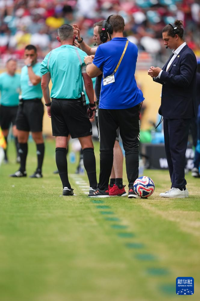 6月29日,工作人员帮助主裁判佩戴摄像头耳机。