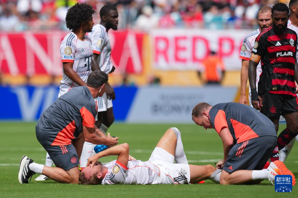 6月29日,拜仁慕尼黑队球员凯恩(中)在比赛中倒地。