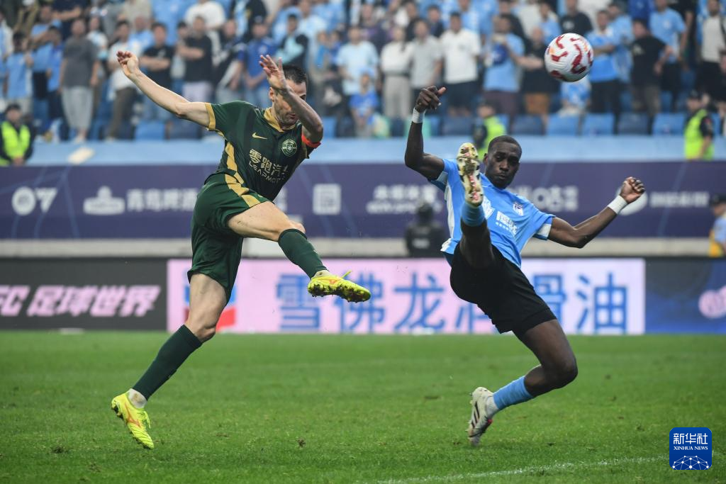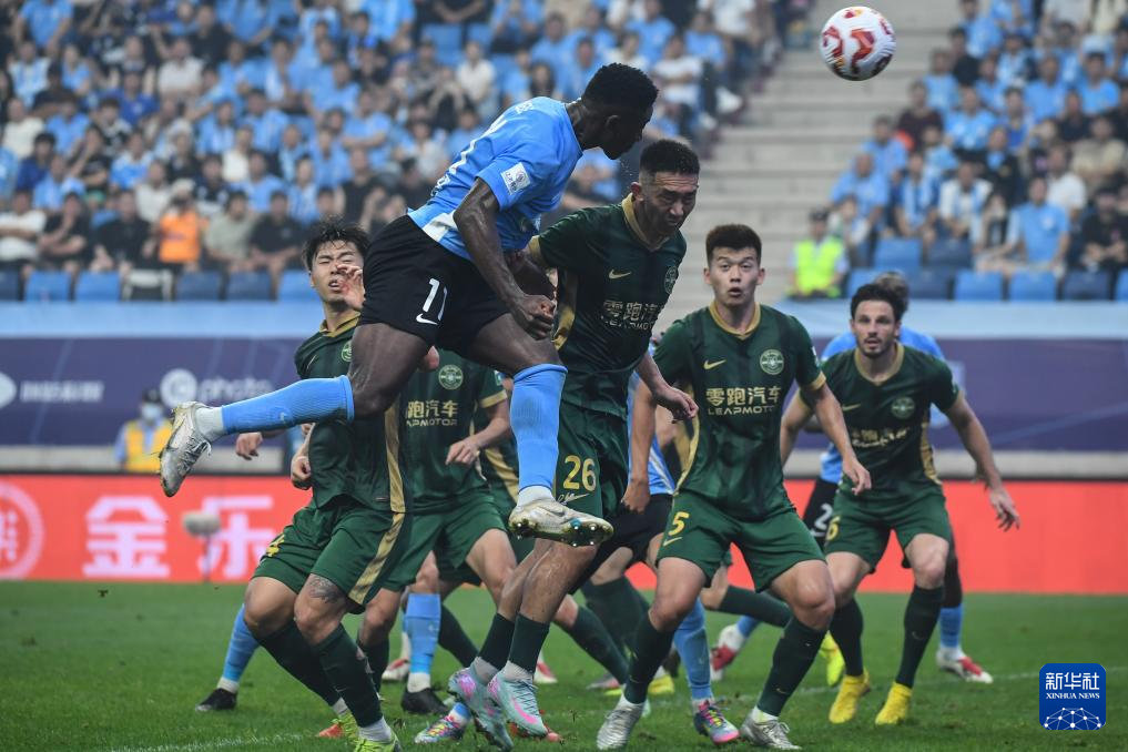 6月30日,大连英博海发队球员马莱莱(前上)在比赛中头球攻门得分。新华社记者 潘昱龙 摄