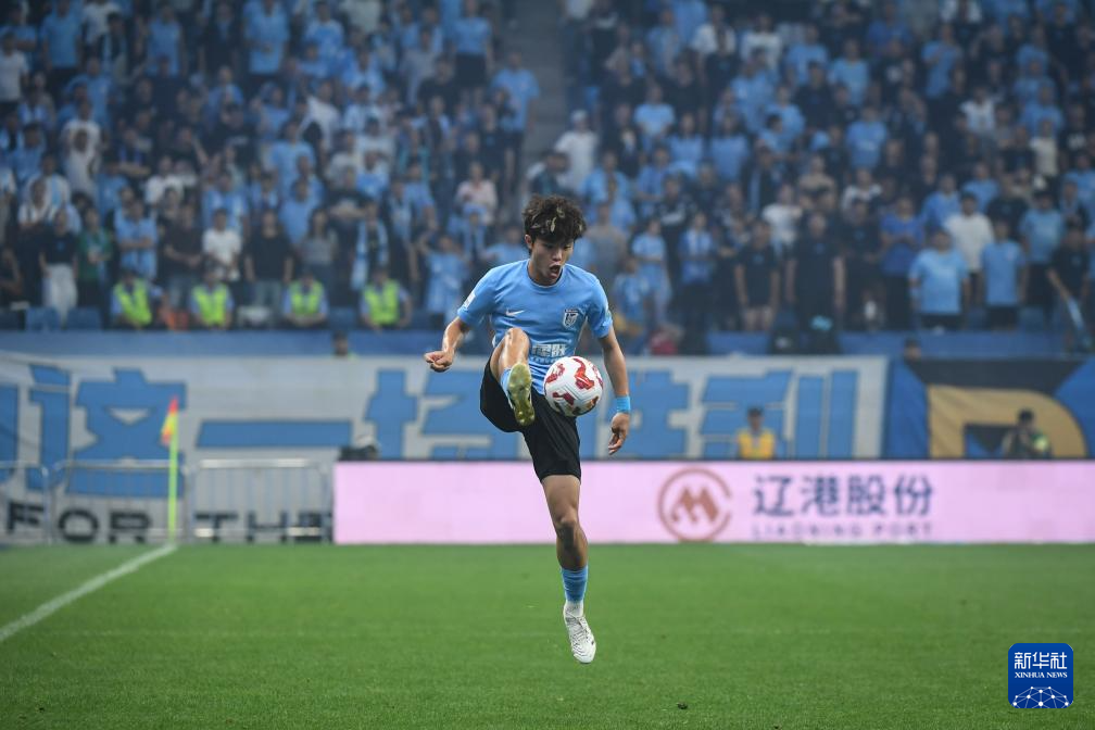 6月30日,大连英博海发队球员吕焯毅在比赛中停球。新华社记者 潘昱龙 摄