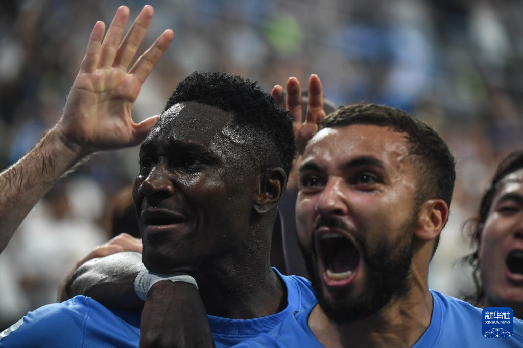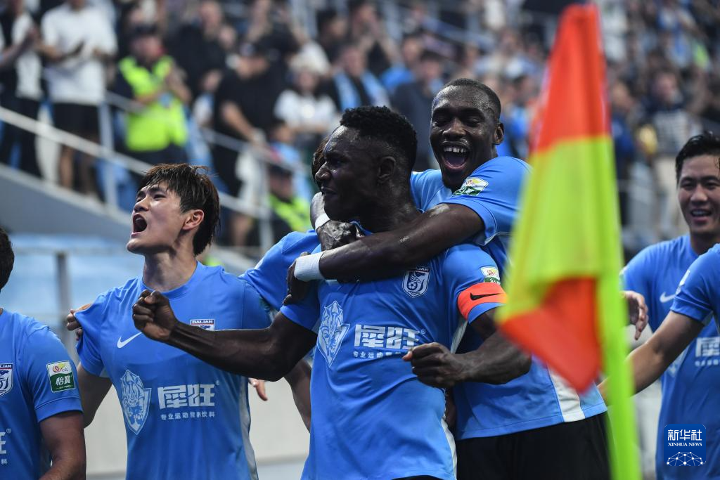 6月30日,大连英博海发队球员马莱莱(前)在进球后与队友庆祝。新华社记者 潘昱龙 摄