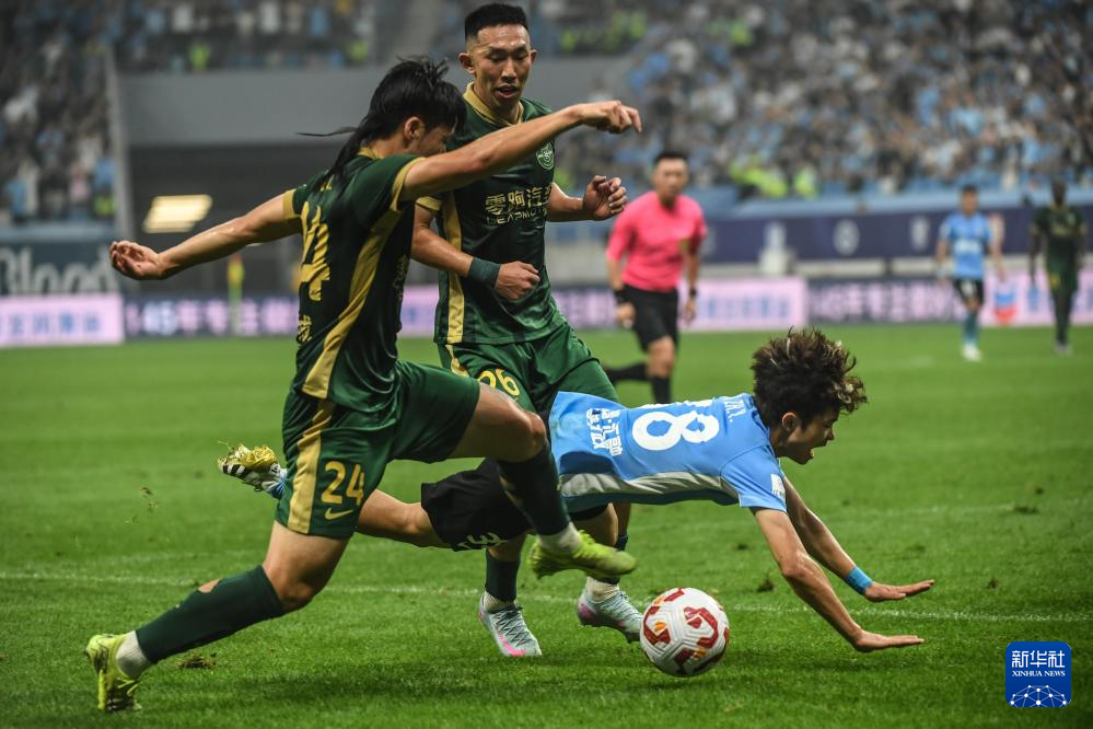 6月30日,大连英博海发队球员廖锦涛(前中)在比赛中带球突破。新华社记者 潘昱龙 摄