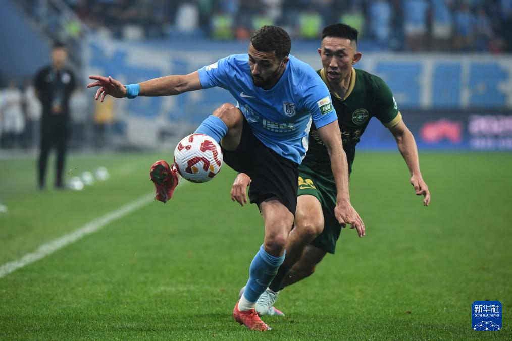 6月30日,大连英博海发队球员拉布亚德(左)在比赛中停球。新华社记者 潘昱龙 摄