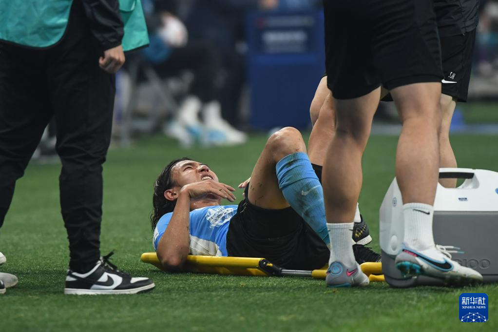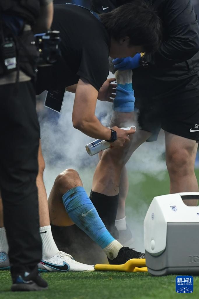 6月30日,大连英博海发队球员廖锦涛(下)在比赛中因伤被替换下场。新华社记者 潘昱龙 摄