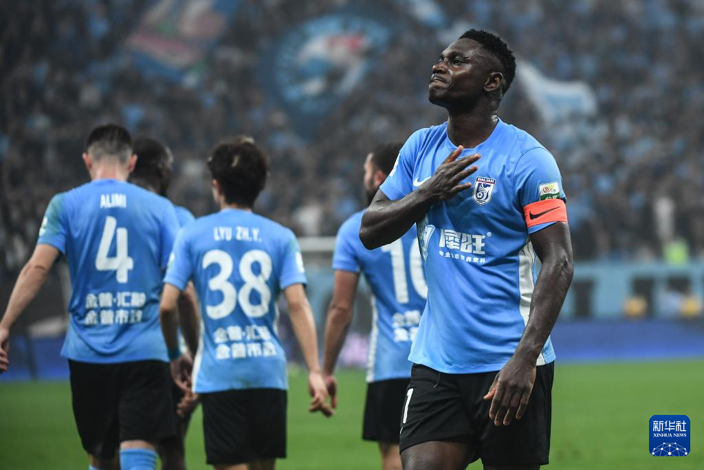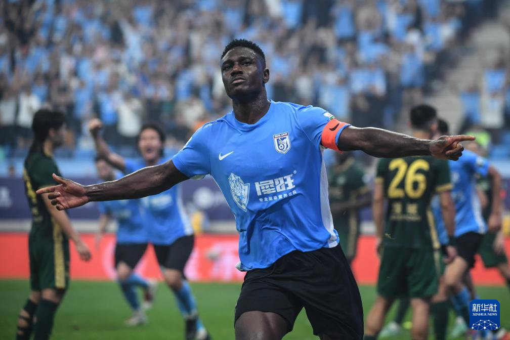 6月30日,大连英博海发队球员马莱莱在进球后庆祝。新华社记者 潘昱龙 摄