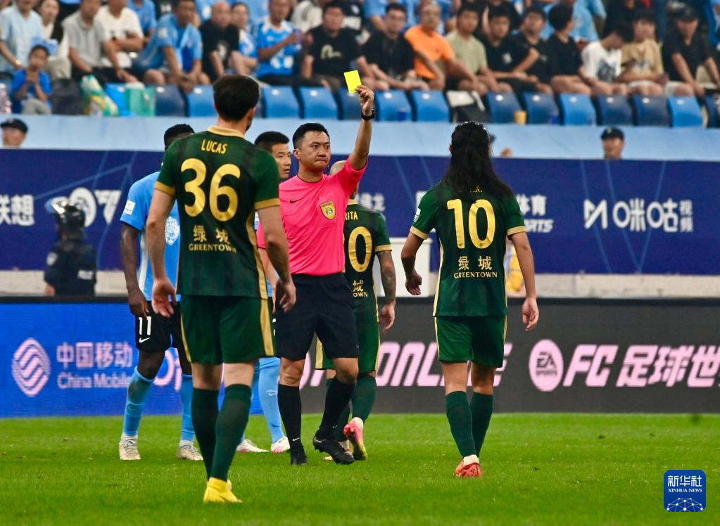 6月30日,主裁判唐顺齐向浙江俱乐部绿城队球员李提香(右)出示黄牌。新华社记者 吴青昊 摄