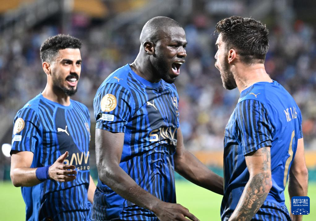 6月30日,利雅得新月队球员库利巴利(中)进球后庆祝。新华社记者 吴晓凌 摄