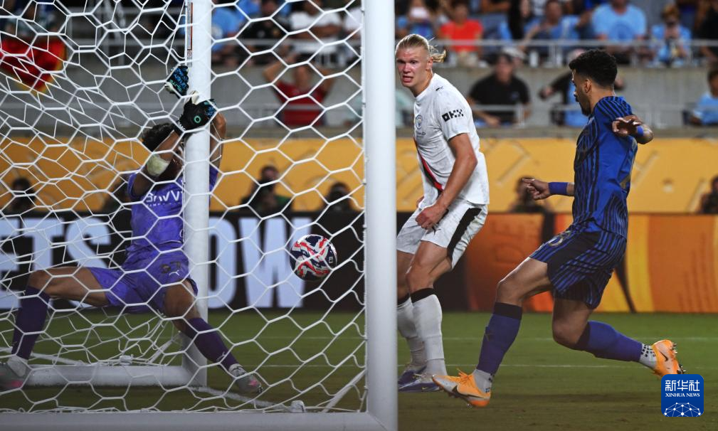 6月30日,曼彻斯特城队球员哈兰德(中)射门险些得分,在球门线上被对方后卫救出。新华社记者 吴晓凌 摄