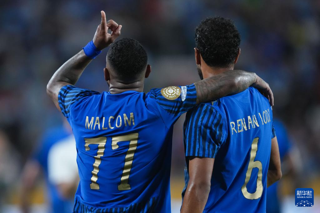 6月30日,利雅得新月队球员马尔科姆(左)在比赛中庆祝进球。新华社记者 许畅 摄