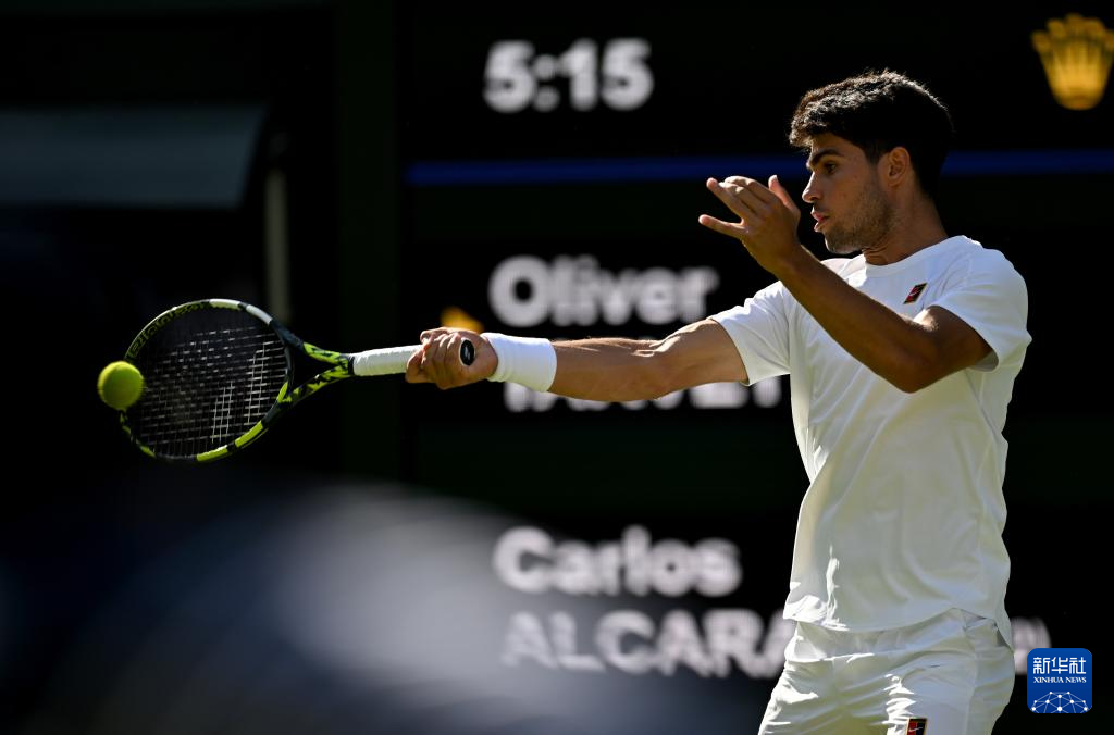 7月2日,阿尔卡拉斯在比赛中回球。新华社记者 李颖 摄