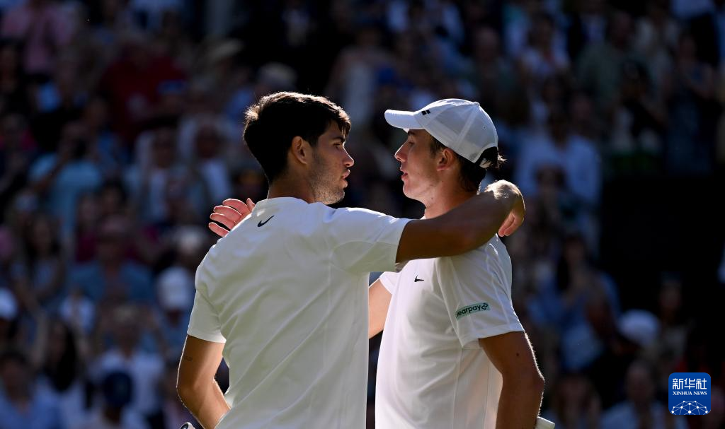 7月2日,阿尔卡拉斯(左)与塔维特赛后相互致意。新华社记者 李颖 摄