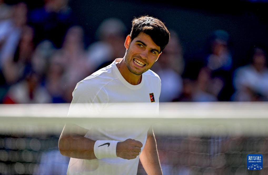 7月2日,阿尔卡拉斯在比赛后庆祝。新华社记者 李颖 摄