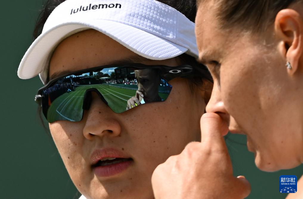 7月3日,郭涵煜(左)/帕诺娃在比赛中交流。新华社记者 李颖 摄