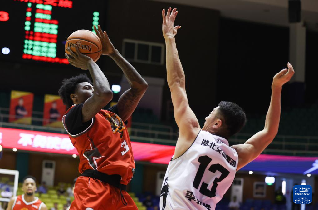 7月3日,湖北文旅队球员吉恩塔尔·西拉(右)在比赛中与石家庄翔蓝队球员热甫卡提江·吐送江争抢篮板球。新华社发(张晓峰摄)