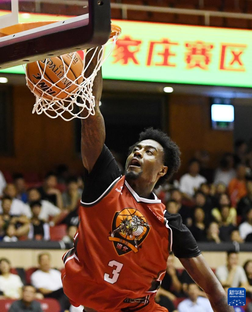 7月3日,石家庄翔蓝队球员戴维恩·沃伦在比赛中扣篮。新华社发(张晓峰摄)