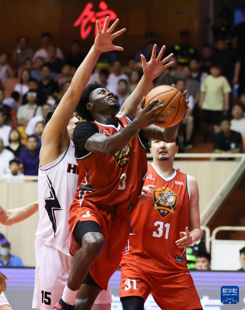 7月3日,石家庄翔蓝队球员阿诺斯克(右)在比赛中上篮。新华社发(梁子栋摄)