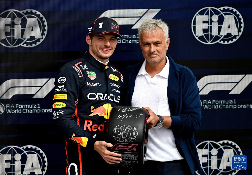 7月5日,获得杆位的红牛车队荷兰车手维斯塔潘(左)在赛后与葡萄牙籍足球教练穆里尼奥手持签名轮胎合影。