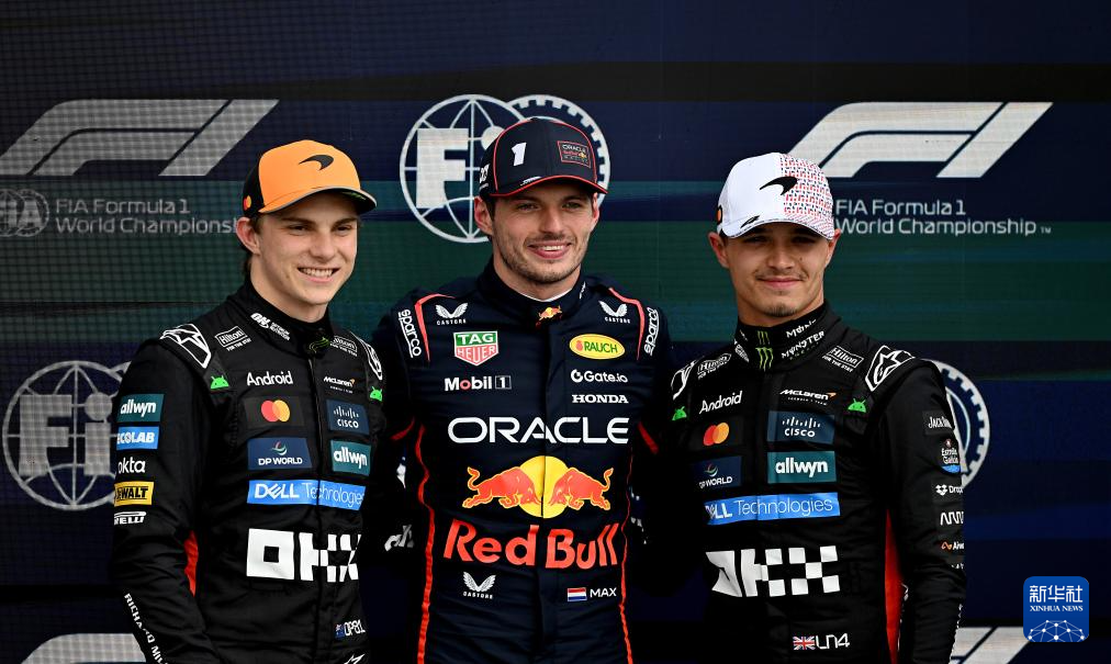 7月5日,获得杆位的红牛车队荷兰车手维斯塔潘(中)、第二名迈凯轮车队澳大利亚车手皮亚斯特里(左)和第三名迈凯轮车队英国车手诺里斯在赛后合影。