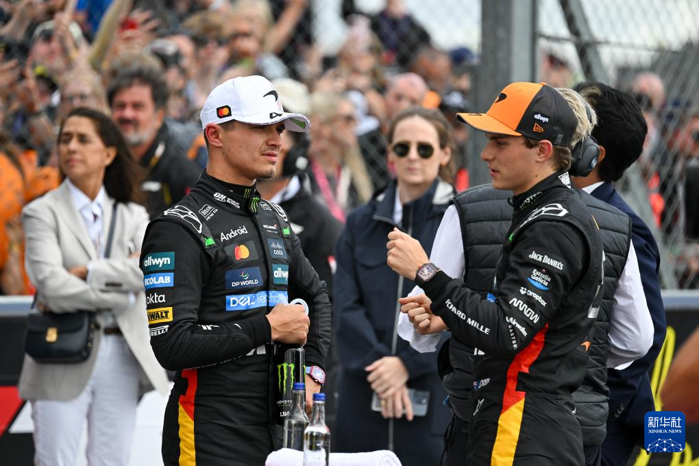 7月5日,获得第二名的迈凯轮车队英国车手诺里斯(前左)在排位赛后与获得第三名的迈凯轮车队澳大利亚车手皮亚斯特里(前右)在赛后交流。