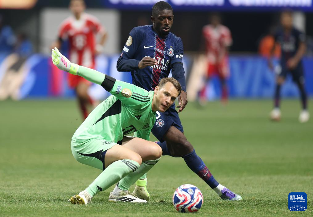 7月5日,拜仁慕尼黑队门将诺伊尔(左)防守巴黎圣日耳曼队球员登贝莱。