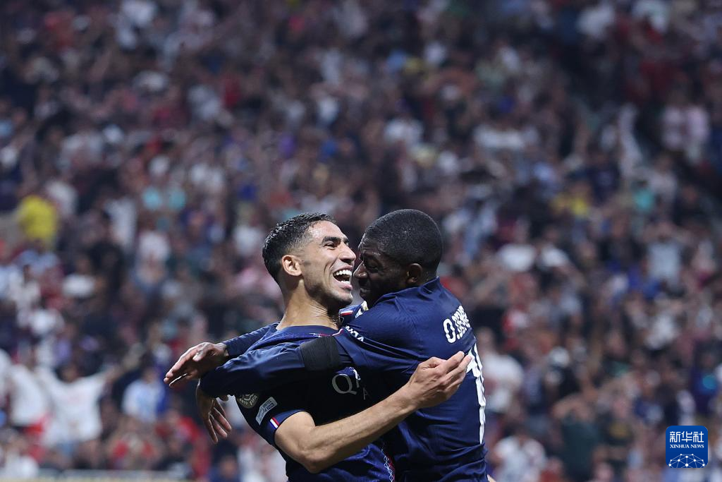 7月5日,巴黎圣日耳曼队球员登贝莱(左)进球后与助攻其破门的队友阿什拉夫·哈基米庆祝。