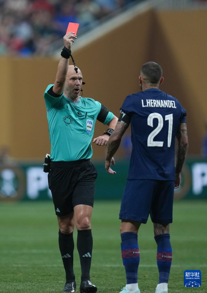 7月5日,主裁判安东尼·泰勒(左)向巴黎圣日耳曼队球员卢卡斯·埃尔南德斯出示红牌。