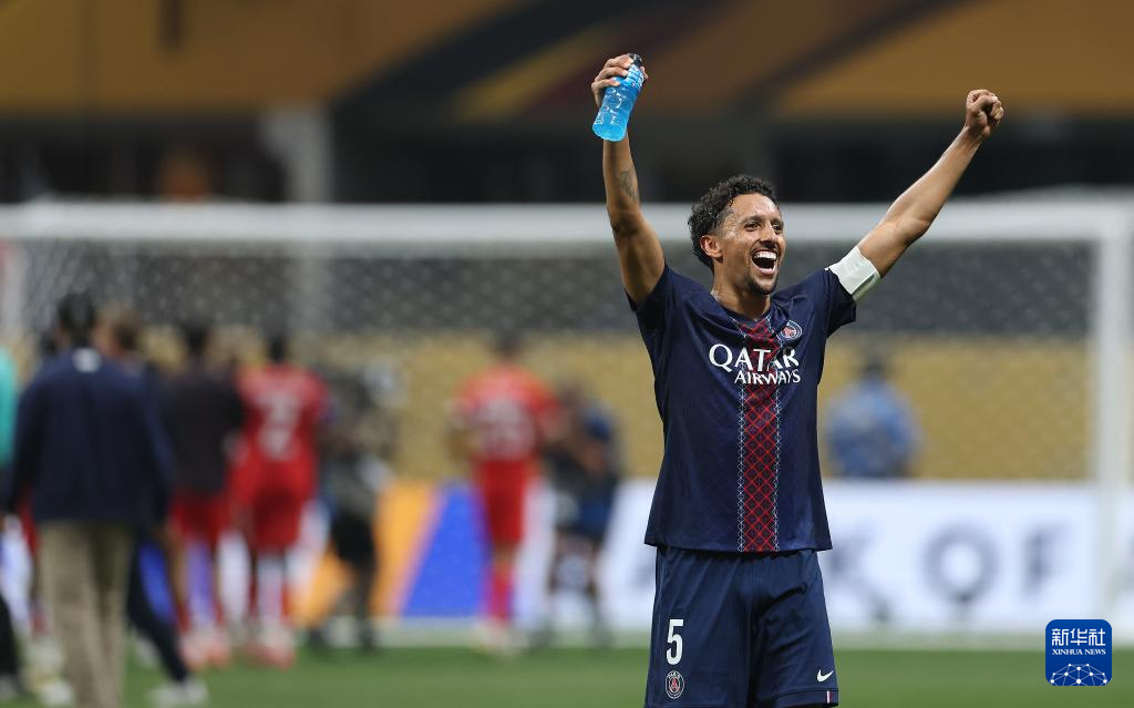 7月5日,巴黎圣日耳曼队球员马尔基尼奥斯(右)在比赛后与队友庆祝胜利。