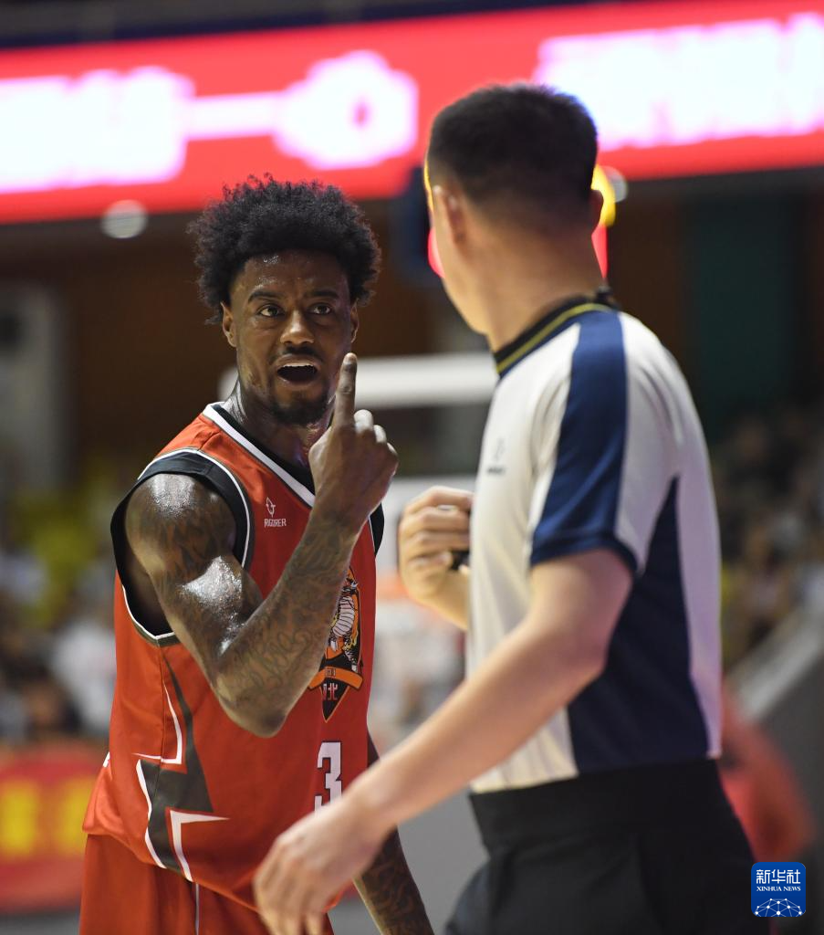 7月6日,石家庄翔蓝队球员沃伦(左)在比赛中与裁判交流。新华社发(张晓峰摄)