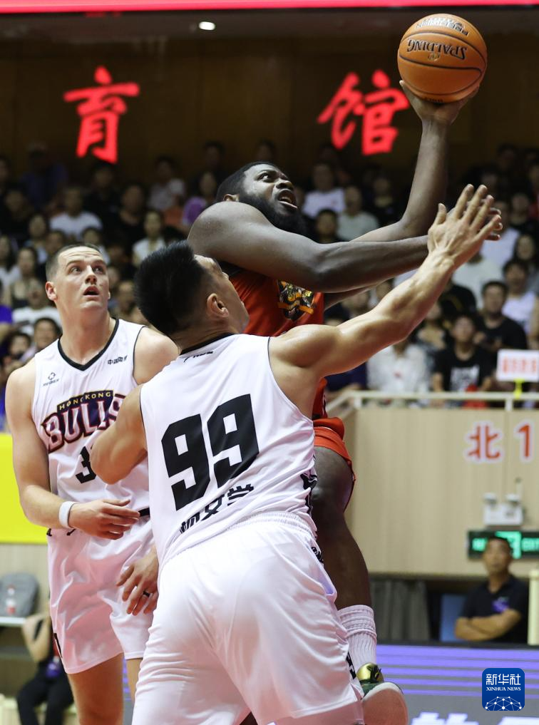 7月6日,石家庄翔蓝队球员帕斯卡尔(左)在香港金牛队球员卡尔顿的防守下投篮新华社发(梁子栋摄)