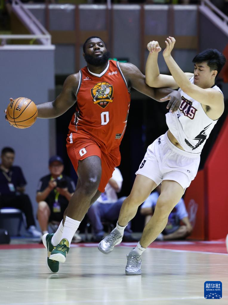 7月6日,石家庄翔蓝队球员帕斯卡尔(右)在比赛中上篮。新华社发(梁子栋摄)