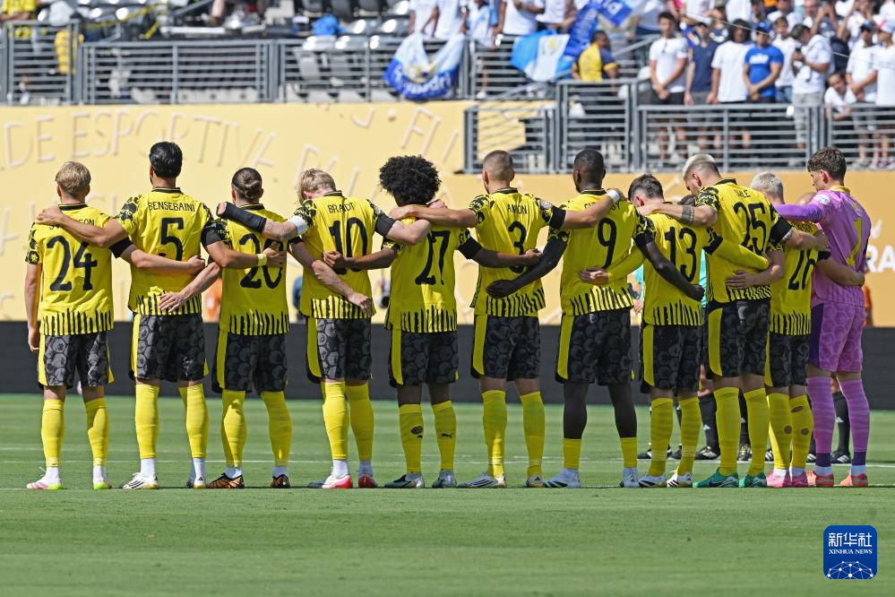 7月5日,多特蒙德队球员赛前向因车祸去世的葡萄牙足球运动员迪奥戈·若塔及其弟弟安德烈默哀。新华社记者 李睿 摄