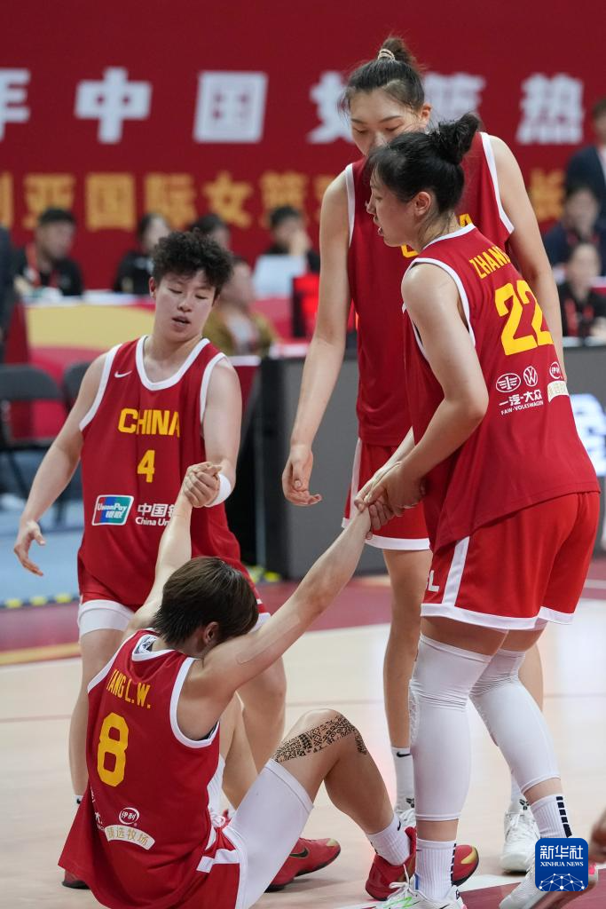 7月8日,中国队球员李缘(上左)、韩旭(上中)、张茹(上右)在比赛中拉起摔倒的队友杨力维。新华社记者 薛宇舸 摄