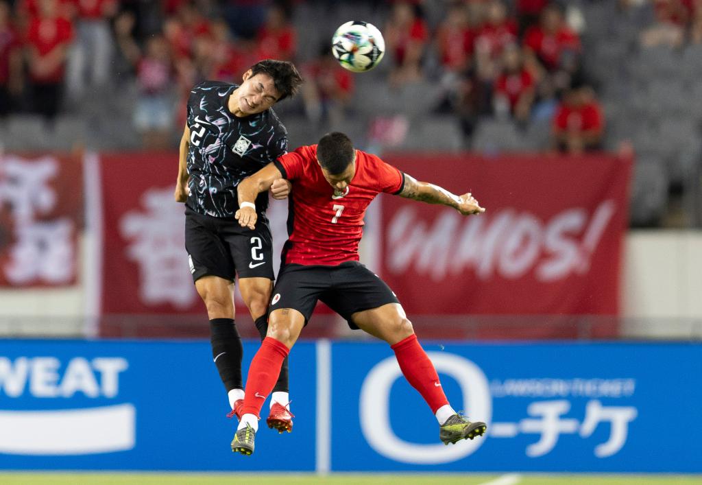 7月11日,中国香港队球员祖连奴(右)与韩国队球员赵玹泽在争顶。新华社发(全休相摄)