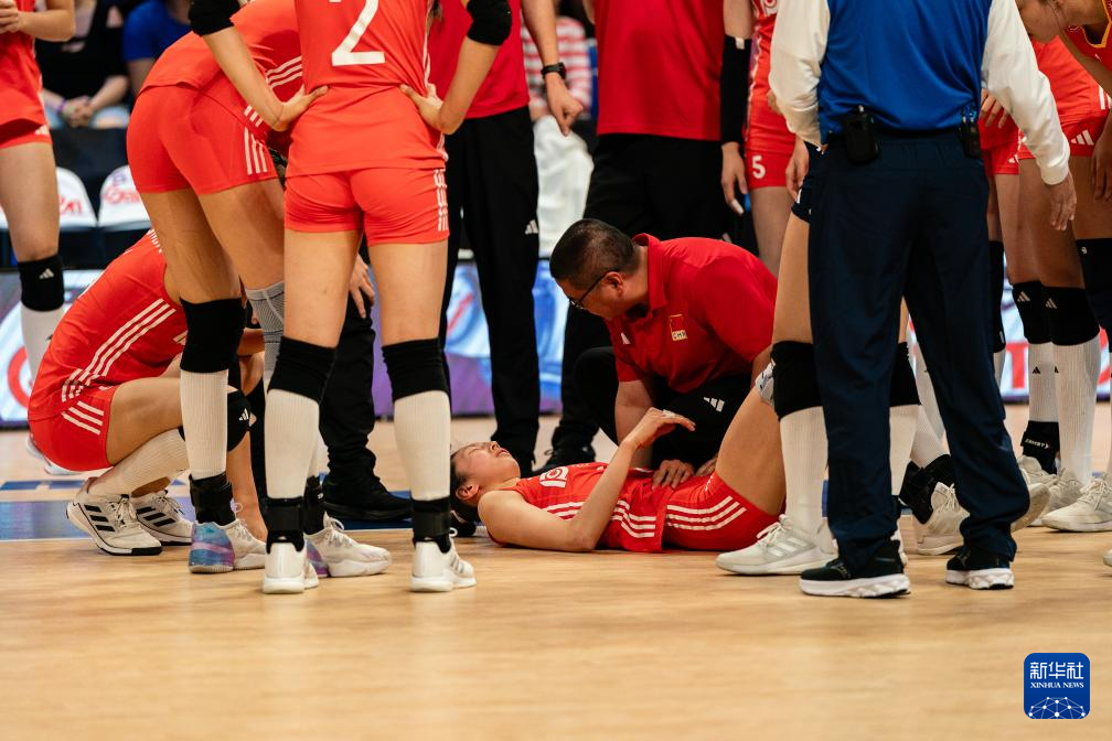 7月12日,中国队球员吴梦洁(中下)在比赛中受伤。