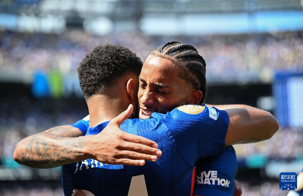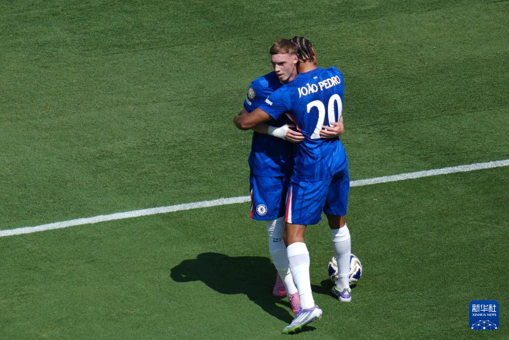 7月13日,切尔西队球员帕尔默(左)和队友若昂·佩德罗在比赛中庆祝进球。