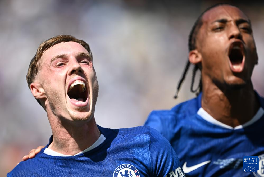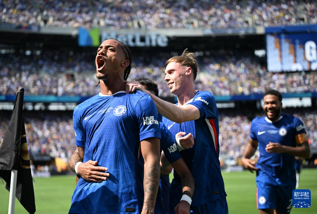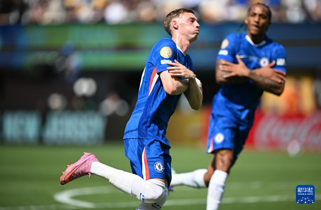 7月13日,切尔西队球员帕尔默(左)在比赛中庆祝进球。