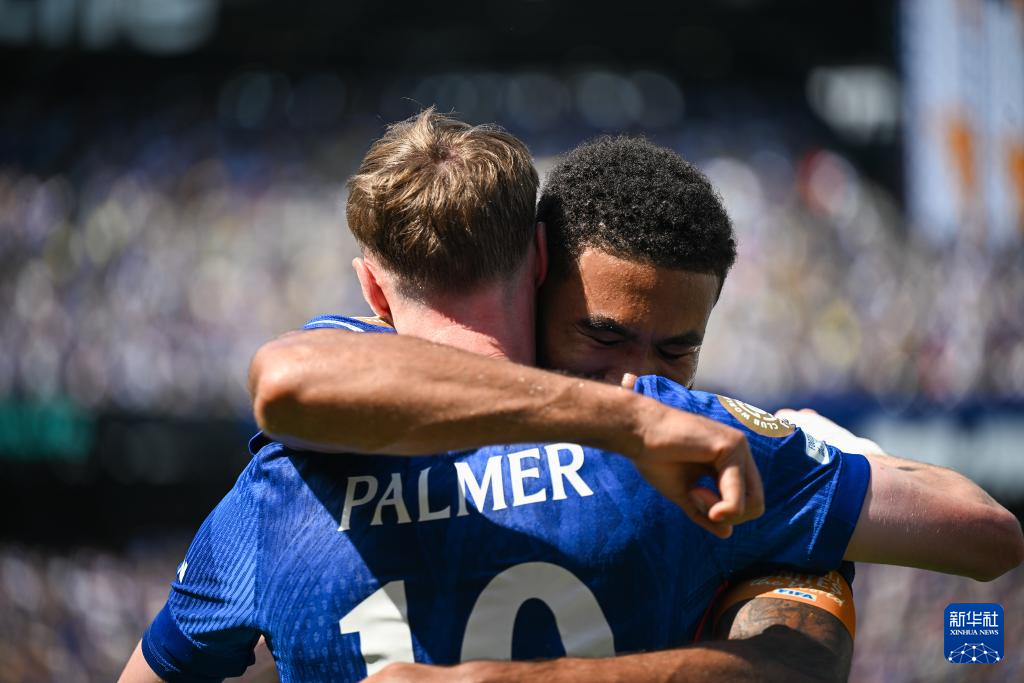 7月13日,切尔西队球员帕尔默(左)和队友庆祝进球。
