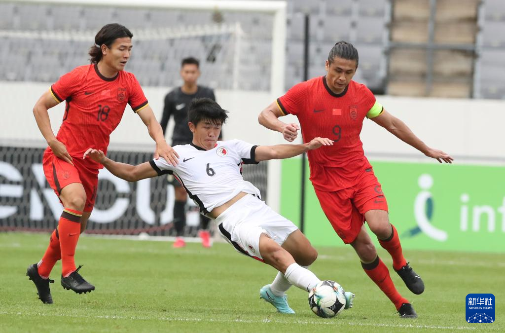 7月15日,中国队球员张玉宁(右)、廖锦涛(左)与中国香港队球员陈俊乐(中)在比赛中拼抢。新华社记者 姚琪琳 摄