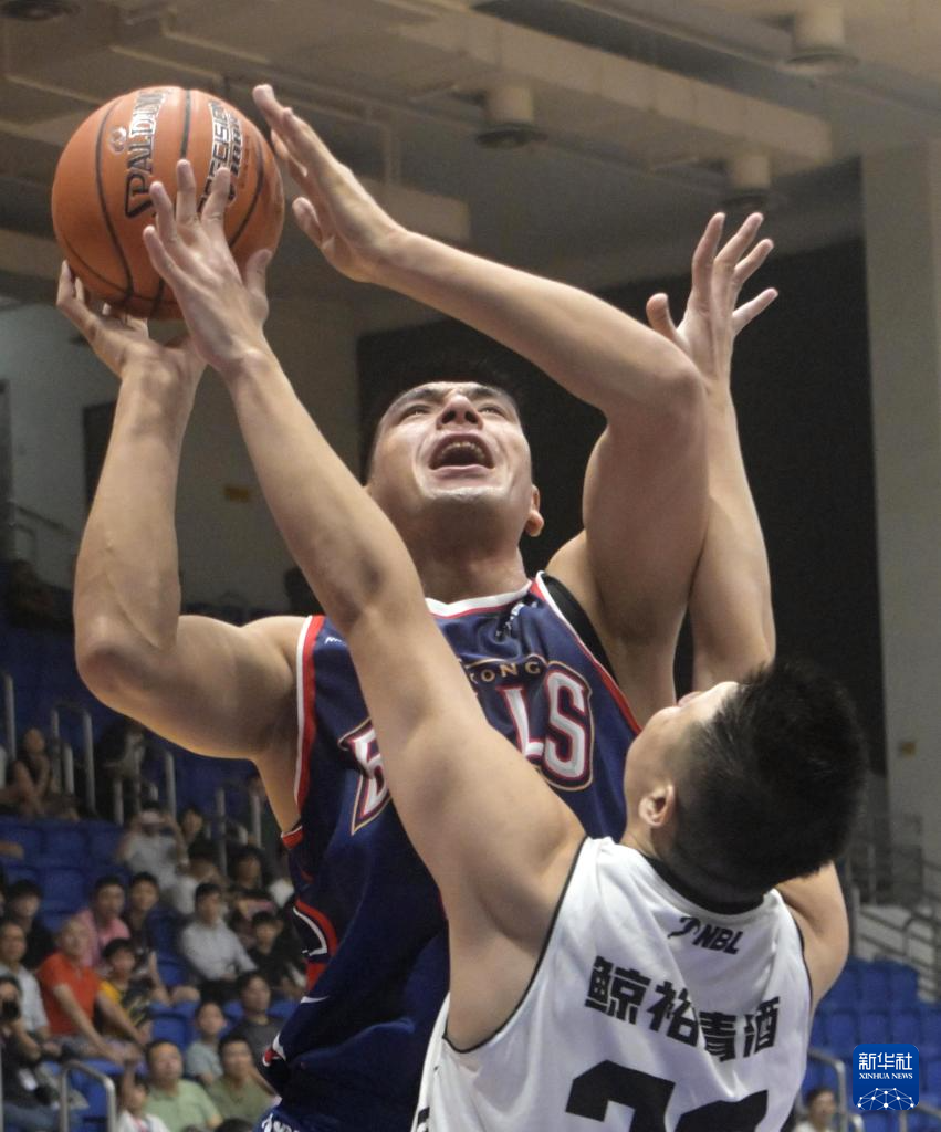 7月15日,香港金牛队球员杨文学(上)在比赛中投篮。新华社发(卢炳辉摄)