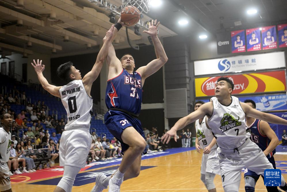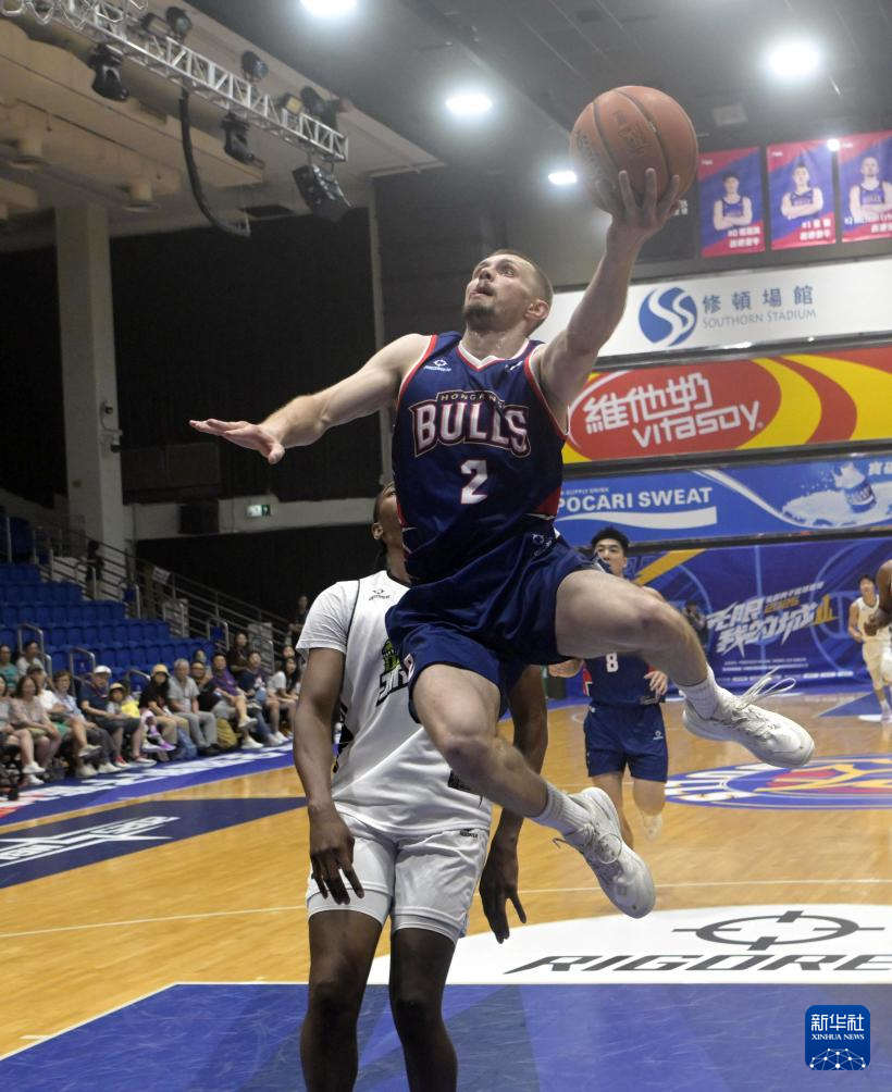 7月15日,香港金牛队球员詹姆斯(上右)在比赛中上篮。新华社发(卢炳辉摄)