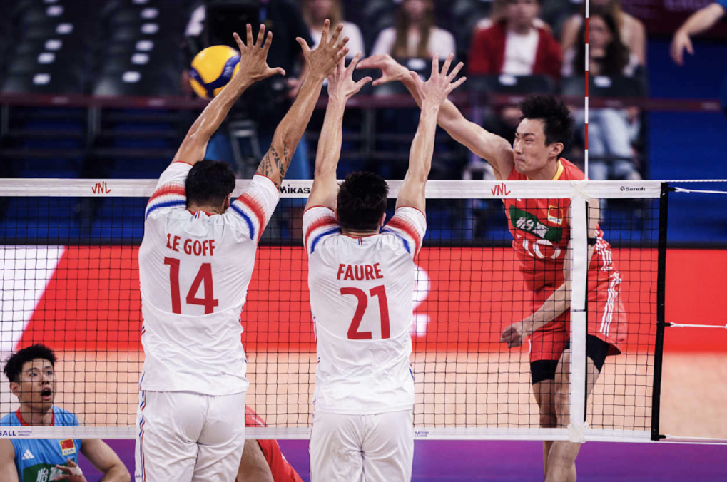 巴黎奥运会冠军法国队在开局阶段未能建立优势,中国队掌控了节奏。老将季道帅两次有效地强攻,帮助中国以22:20领先。随后,王滨送出一记发球直接得分,将领先优势进一步扩大。虽然法国队奋力反击,但未能逆转局势。李咏臻在关键时刻的一次快攻,帮助中国队以25:22先下一城。