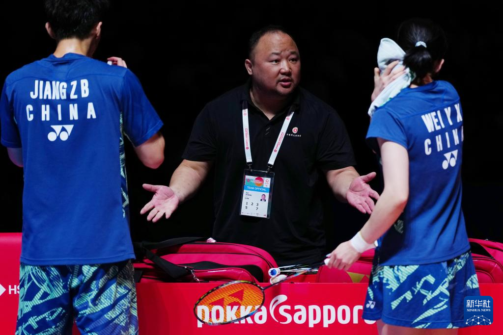 7月20日,中国羽协主席张军(中)在比赛间隙指导蒋振邦(左)/魏雅欣。