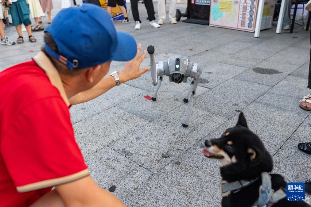 7月19日,在赛场外,市民牵着宠物狗和机器狗互动。